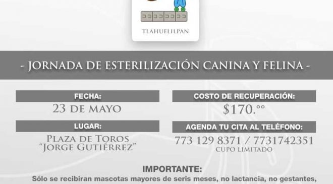 Tlahuelilpan.- Autoridades municipales encargadas de la salud, han anunciado para el próximo día domingo 23 de Mayo, la jornada de “esterilización canina y felina” a bajo costo, con la cual se promueve el cuidado animal, la salud y la cultura de ser dueños responsables de las mascotas con las que se convive diariamente.