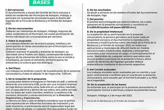 El municipio de Actopan Hidalgo, invita a participar en el concurso anual 2022 para el diseño de logotipo de la Feria del Ximbo y la Barbacoa 2022, en donde los participantes podrán mostrar diseños únicos y creativos.