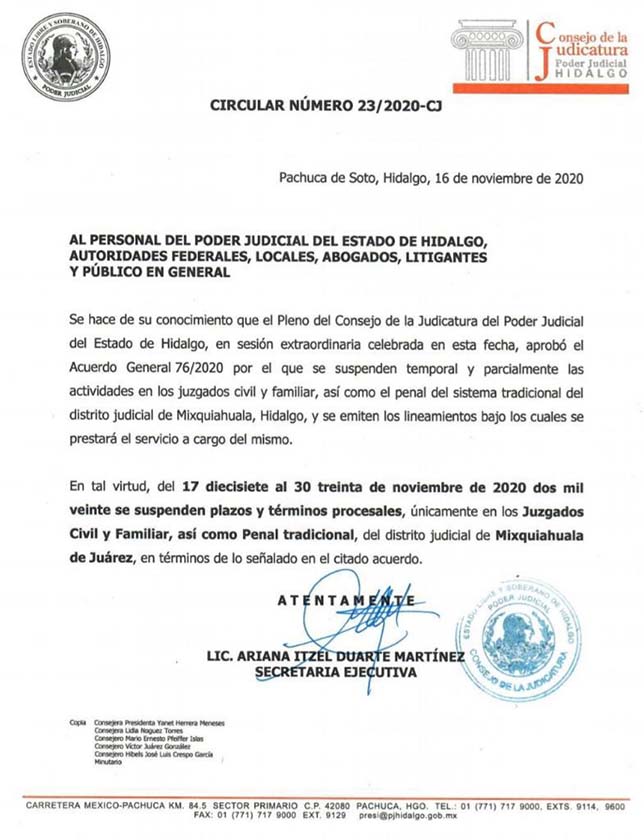 También se suspenden plazos y términos procesales Mixquiahuala.- Mediante una circular emitida el pasado 16 de Noviembre de este año, la Secretaria Ejecutiva del Consejo de la Judicatura, Licenciada Ariana Itzel Duarte Martínez, dio a conocer que el Pleno del Consejo de la Judicatura del Poder Judicial del Estado de Hidalgo, en sesión extraordinaria aprobó el Acuerdo General 76/2020 mediante el cual se suspenden temporal y parcialmente las actividades de los juzgados civil y familiar, así como el penal del sistema tradicional del distrito judicial de Mixquiahuala de Juárez. La…