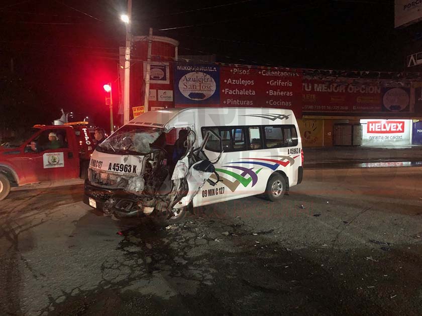 Mixquiahuala.- Cerca de las 6:30 horas del pasado viernes 20 de septiembre un fuerte accidente automovilístico se registró en el concurrido cruce de la Avenida Reforma con la Calle Cuitláhuac, de la cabecera municipal, en el que una combi del transporte público se vio involucrada. Los hechos se registraron cuando bajo circunstancias no muy claras, los conductores de la combi del transporte público de la ruta Mixquiahuala-El Moreno, con matrículas A45963K y de una camioneta Nissan con caja seca, propiedad de una panadería del municipio de Progreso de Obregón impactaron…