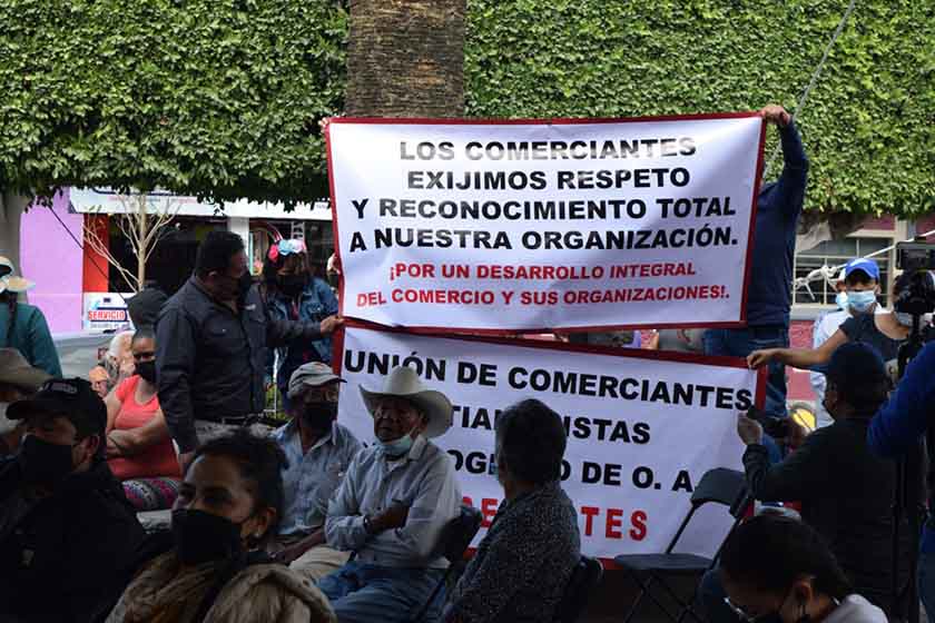 Se manifiestan comerciantes durante evento del precandidato de Morena Julio Menchaca en Progreso de Obregón
