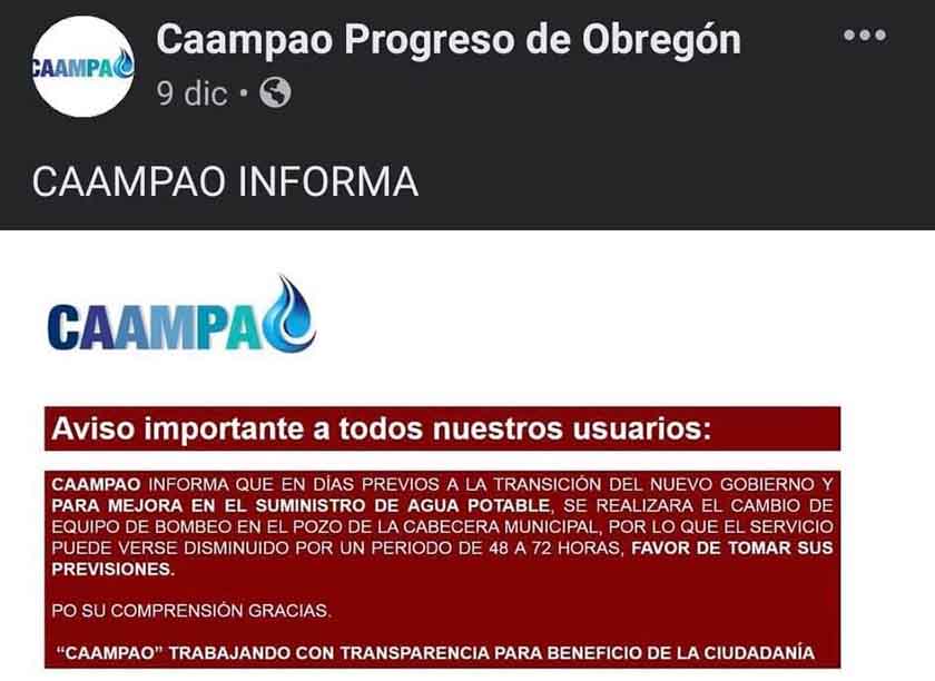 Progreso.-Pese a que el pasado día 9 de Diciembre a través de un comunicado publicado en redes sociales, la Comisión de Agua Y Alcantarillado del Municipio de Progreso de Obregón, CAAMPAO, informó que debido al cambio en el equipo de bombeo del pozo de la Cabecera Municipal, el servicio podría verse disminuido por un lapso de 48 a 72 horas, al día de doy, es decir 9 días después, los habitantes de la zona centro siguen padeciendo la escasez del vital líquido sin que nadie les informe qué sucede o…