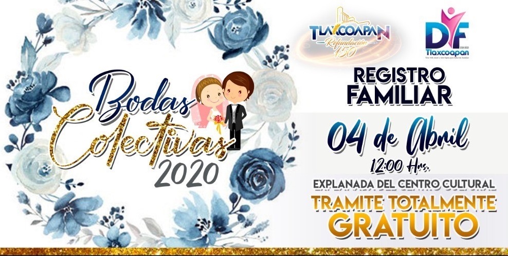 Serán el próximo 4 de Abril Tlaxcoapan.- El Gobierno Municipal de Tlaxcoapan, que encabeza el alcalde Jovani Miguel León Cruz lanzó una invitación a la ciudadanía en general para participar en el programa de “Bodas Colectivas 2020” que se llevará a cabo en la localidad. Según explicaron, será el próximo día sábado 4 de abril, en punto de las 12:00 horas, en la explanada del foro cultural “Benito Juárez”, cuando se lleve a cabo la celebración de dichas bodas colectivas a las parejas que se hayan inscrito en este programa.…