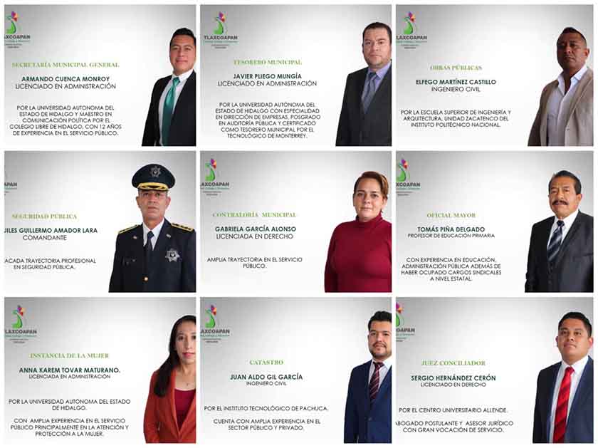 Tlaxcoapan.- El Presidente Municipal Constitucional de Tlaxcoapan Jaime Pérez Suárez dio a conocer los perfiles, formación y trayectoria de quiénes conformarán su gabinete de funcionarios dentro de la administración municipal 2020-2024. Este equipo se conformó desde días antes de asumir el cargo, seleccionando hombres y mujeres tanto jóvenes como de experiencia que le ayudarán a llevar a cabo el rescate del municipio de Tlaxcoapan conjugando todas sus capacidades y profesionalismo. El gabinete fue presentado abiertamente a la ciudadanía para que conozca quienes serán las personas que atenderán cada una de…